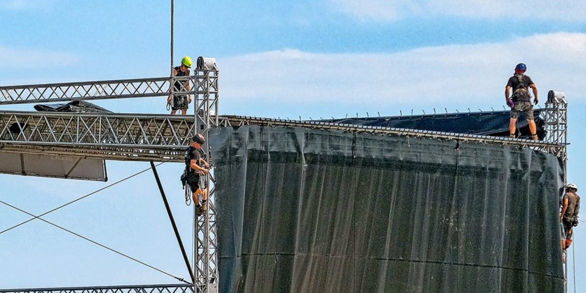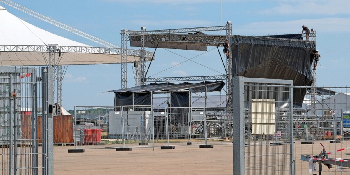 Auf dem Lerchenkamp in Drispenstedt herrscht auch vor dem Gelände Betrieb, die ersten Fans sind bereits schon vor Ort und warten auf Einlass. Sichtliche Freude herrscht beim Anblick der großen Bühne. Die große, mehr als 30 Meter breite Auftrittsplattform steht bereits, muskulöse Männer turnen noch in luftiger Höhe umher, um das Bühnengerippe sicher zu befestigen. Eine Fläche von 15 Metern steht dann für die Musikerinnen und Musiker bereit. Demnächst wird die Licht- und Tontechnik installiert.
