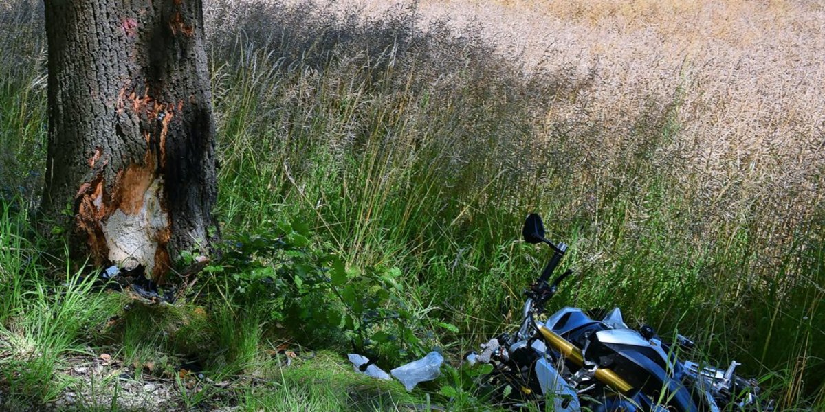 Das Fahrzeug rutschte ein kurzes Stück übers Gras, dann prallten Fahrer und Motorrad mit voller Wucht frontal gegen einen Baum. Anschließend rutschten sie eine kleine Böschung hinab.