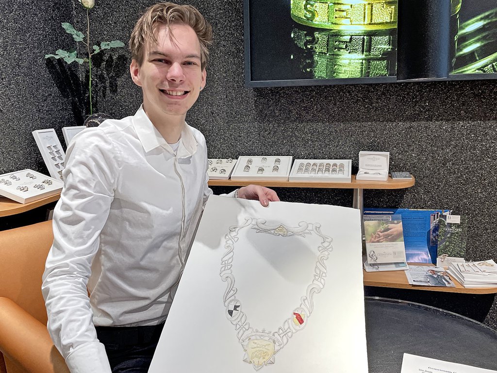 Der St. Sebastianus Schützenverein braucht allerdings einen Ersatz und meldete sich deshalb in der Meisterschule der Handwerkskammer zu Köln. Die Idee: Statt die alte Kette auf exakt gleiche Weise nachzufertigen, sollte eine neue designt werden. Der Schützenverein rief einen Wettbewerb ins Leben, an dem alle 13 Schüler und Schülerinnen der Meisterklasse Gold- und Silberschmiede teilnahmen. Einer von ihnen: Simeon Andreas Prade. Der 24-jährige Hildesheimer arbeitet seit zwei Jahren in der Goldschmiede Maertens am Markt – und ist für seine Meisterlehre auch immer wieder an der Schule in Köln.