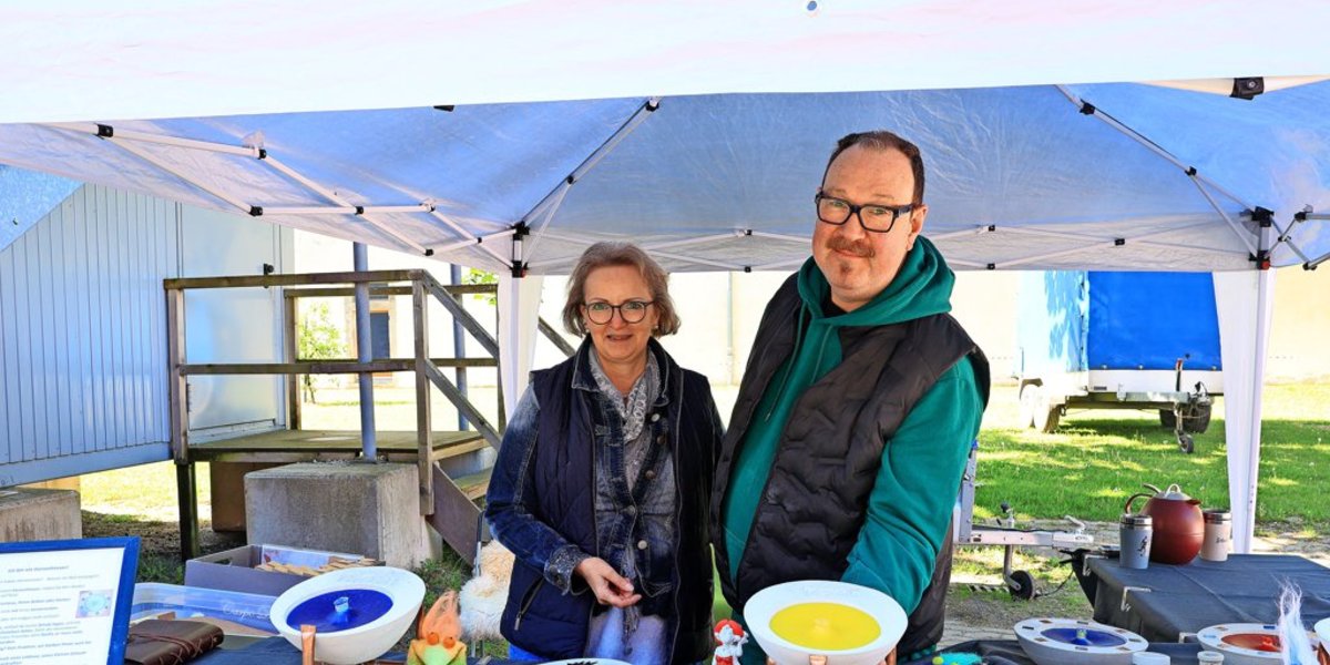 Kerzenreste gibt es bei Susanne und Matthias Simon aus Borsum nicht mehr, nachdem sie den Kerzenfresser erfunden haben. In eine Betonschale gießen sie Wachs, dazu einen Dauerdocht. „Der entwickelt so eine Hitze, dass das Wachs verdampft“, erklärt Susanne Simon. Dorthinein können Kerzenreste gelegt und so weiterverwertet werden. 38 Euro kostet so ein Kerzenfresser mit Kerzenlöscher und handgemachter Betonschale.