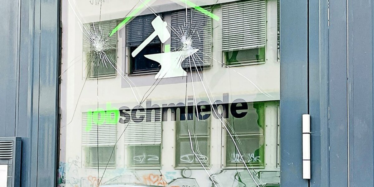 Besonders auffällig sind die Einschüsse auch an der Tür zur sogenannten Job-Schmiede, zu der man über den Eingang am Marienfriedhof gelangt. Dort ist die Eingangstür aus Glas durch mindestens zwei Einschüsse gesprungen. Dennoch antwortet der Polizeisprecher: „Den Ermittlungen zufolge spricht momentan allerdings nichts dafür, dass der Beschuss mit einer erlaubnispflichtigen Feuerwaffe erfolgte.“