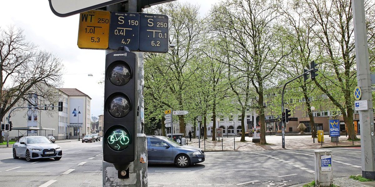 Allerdings verliere die Verwaltung trotz allen Bemühens, Radler und Busse besser vorankommen zu lassen, die Autos nicht aus dem Auge, versichern Beyer und Brandes unisono. Und so werden die Fahrer zwar an der Vorschaltampel ausgebremst. Dafür aber haben sie nun mehr Zeit, die PvH-Kreuzung zu überqueren, weil die Stadt die Grünphasen dort verlängert hat – vor allem mit Blick auf die Rechtsabbieger in Richtung Wollenweberstraße. Diese zusätzliche Zeit sei nötig, um zu verhindern, dass die Staus auf der Schuhstraße bis zum Bohlweg reichten, erklärt Rathaus-Mitarbeiterin Beyer.