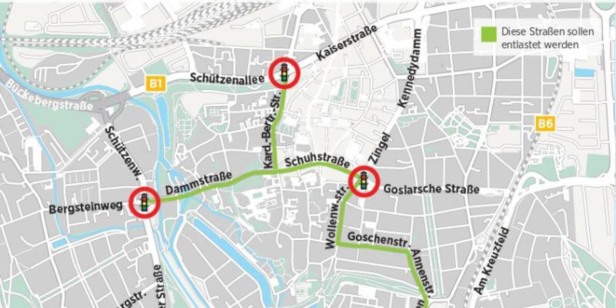 Die neuen Busspuren verdrängen natürlich jene Fahrbahnen, die zuvor auch für Autos nutzbar waren. So gibt es etwa auf der Schuhstraße nur noch eine Spur für Autofahrer und -fahrerinnen, die Richtung Wollenweberstraße oder Goslarsche Straße wollen. „Die Fahrspuren sind so gewählt, dass die Strecken, die mehr Verkehr aufnehmen sollen, gegenüber den Strecken, auf denen der Verkehr abnehmen soll, aufgewertet werden“, sagt Miethe. Heißt: Die Verbindung Zingel-Goslarsche Straße wird künfig bevorzugt bedient. Wer in die vielbefahrene Schuhstraße oder Wollenweberstraße will, muss dagegen länger warten.