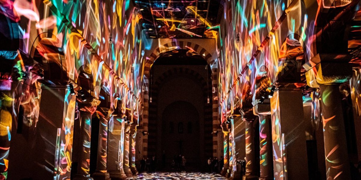 Neben St. Andreas werden noch vier weitere Innenstadt-Kirchen bei den Lichtungen bespielt. In zweien geht es besonders bunt zu. In der St. Bernwardkirche, gegenüber vom Wasserparadies, erscheinen auf drei großen LED-Wänden Unterwasserfilme, die von einer Künstlichen Intelligenz bearbeitet worden sind. Der Titel „Sediment Nodes“ (Knotenpunkte in Ablagerungen) klingt kryptischer als das Ergebnis. Offenbar ist die KI reichlich mit „Findet Nemo“ gefüttert worden, jedenfalls liebt sie knallige Farben und dekorative Schnörkel. Den – seltsam unpassenden – Teppich dazu bilden düster dräuende Elektroniksounds.