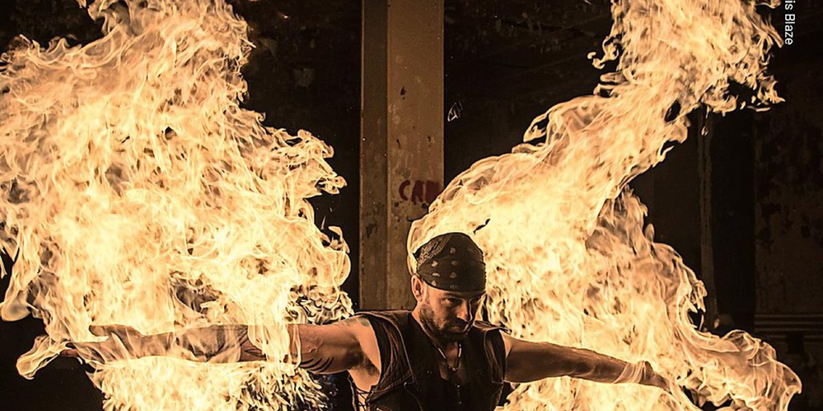 Feuershows leben von der Gefahr, der sich Artisten aussetzen. Chris Blaze spuckt und schluckt Feuer. Er tanzt beweglich wie eine Katze mit den Flammen und rollt brennende Langhanteln über seinen Körper.