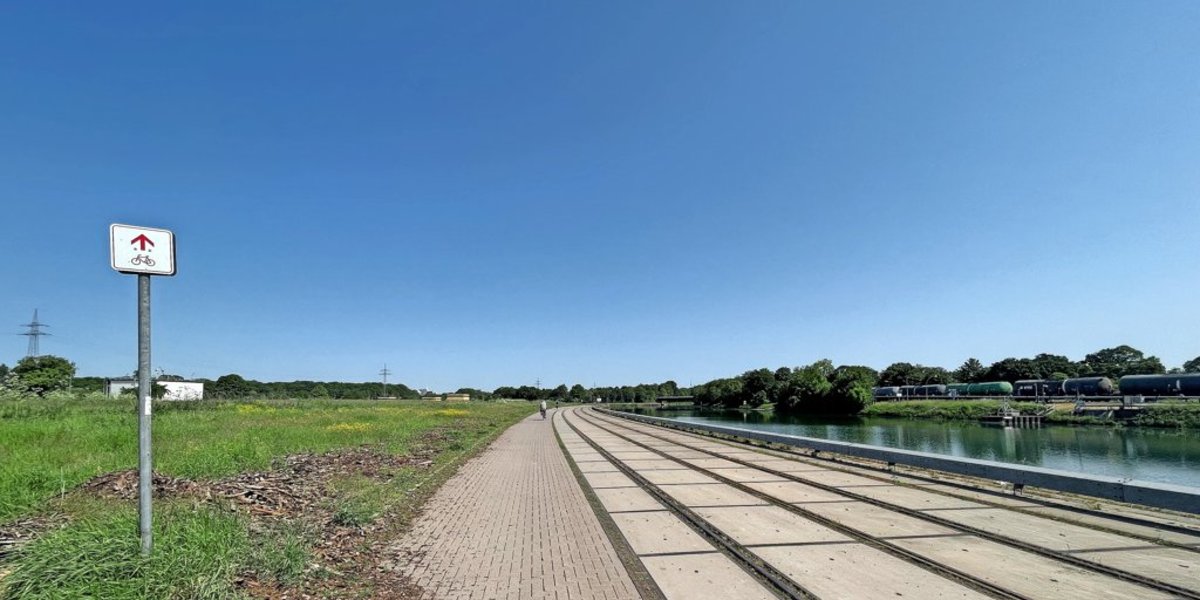 Los geht es in der Kanalstraße am Hildesheimer Hafen. Dort startet der Fahrradweg entlang des Westufers des Stichkanals.