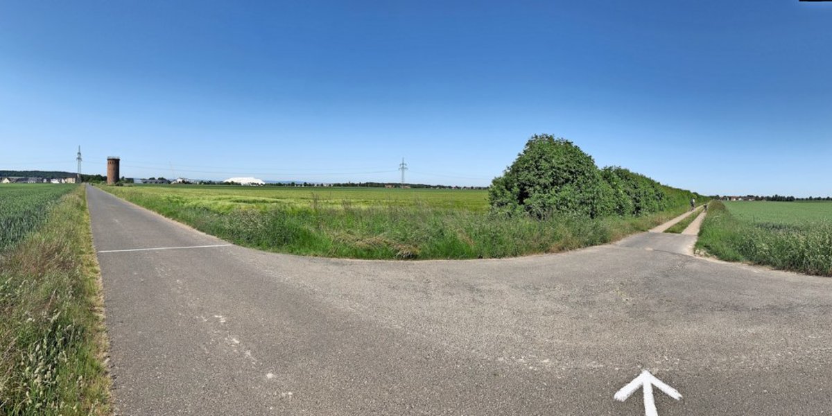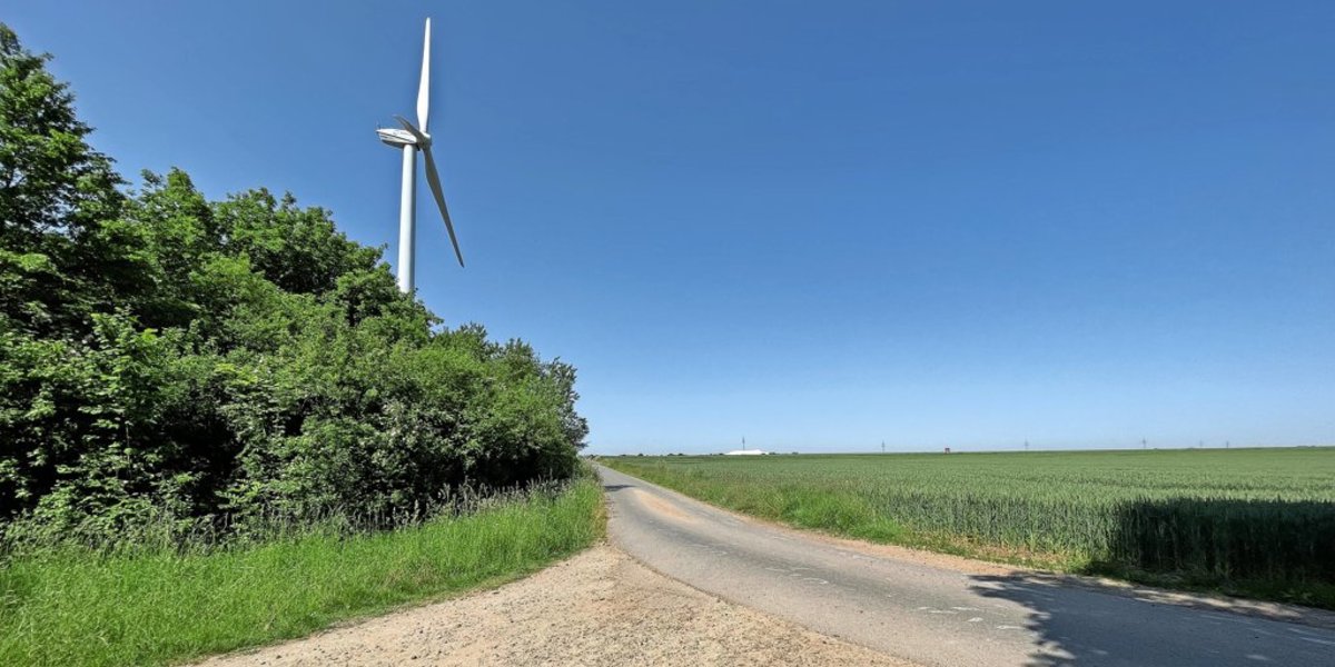 Jetzt geht es über die Felder. Fahren Sie ein paar Meter Richtung Autobahn (Norden), bis zu Ihrer Linken ein Weg zum nahen Windrad abzweigt.