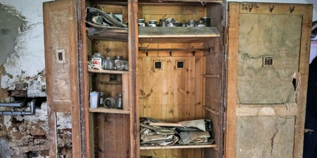 In einem beschädigten Holzschrank stehen reihenweise leere Obstgläser. Jahrzehntealte Behälter. „Die waren zum Einmachen“, sagt Kreisheimatpflegerin Paloma Klages, die sich in der Gruppe ebenfalls ein Bild vom Inneren des Hauses macht.