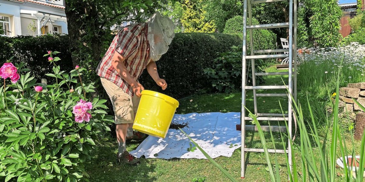 Als Hertle wenig später im Garten von Irmgard und Peter Spilker steht, staunt auch er: „Das sind sicher 50.000 Tiere.“ Dass Bienen schwärmen, ist an sich nichts Ungewöhnliches. „Aber in diesem Jahr schwärmen die wie irre“, sagt er. Im kalten Frühjahr haben sich die Insekten gut entwickelt und die kühlen Nächte bekommen den Bienen ebenfalls gut. Außerdem sei es bisher nicht so trocken wie in den Vorjahren gewesen.