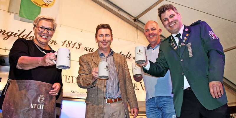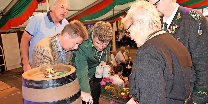 Sarstedt - Das Anstechen eines Bierfasses kann mitunter eine feuchte Angelegenheit werden. Doch nicht so beim Fassanstich am Freitagabend, mit dem Bürgermeisterin Heike Brennecke das Volks- und Schützenfest in Sarstedt offiziell eröffnet hat. Ohne große Spritzer und nach zwei, drei festen Schlägen mit dem Holzhammer war das Fass zapfbereit. Schäffer Kai Kosowski und Brauereivertreter Carsten Engelmann ließen dann auch gleich die ersten Humpen zum Anstoßen volllaufen.