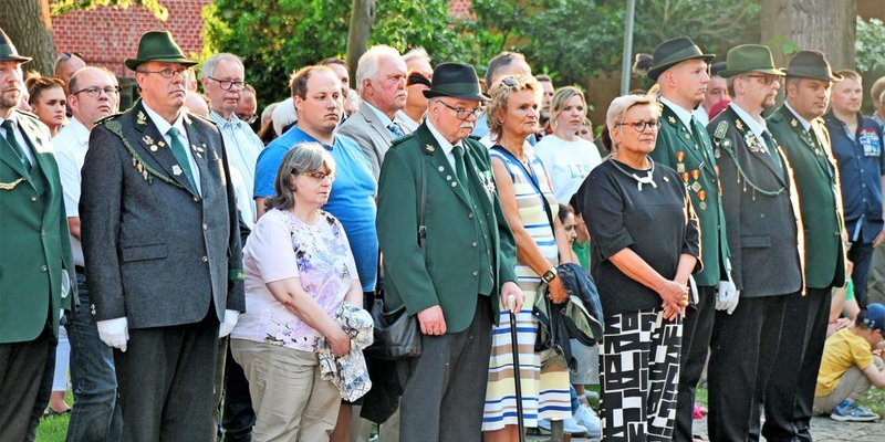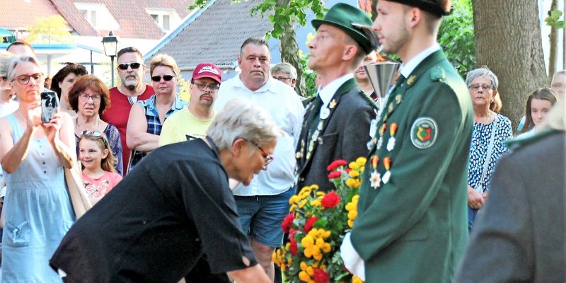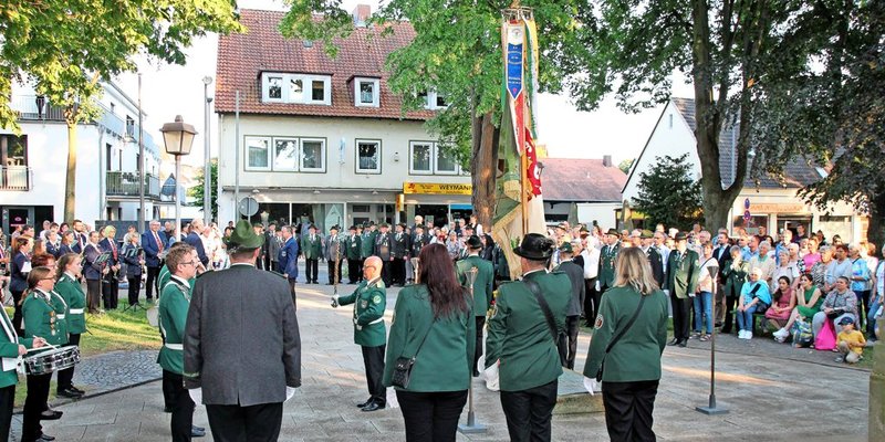 Schützen und Schützinnen, Ratsmitglieder, Blasorchester und Spielmannszug machten sich nach dem ökumenischen Gottesdienst, dieses Jahr in der St.-Nicolai-Kirche, auf zum Ehrenmal am Friedrich-Ebert-Park, an dem Bürgermeisterin Heike Brennecke einen Kranz niederlegte zum Gedenken an die Gefallenen der Kriege.