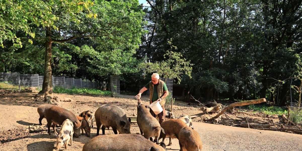 Inzwischen ist Paula neun Jahre alt, sie hat viele Frischlinge zur Welt gebracht und war selbst immer eine verlässliche Mutter. Jetzt wühlt sie mit ihrem Rüssel auf dem Beton und im Schlamm nach Maiskörnern. Zwischen ihr und den anderen Schweinen fegen gleich mehrere Nachwuchs-Generationen durchs Gehege, gepunktet oder gestreift und ein absoluter Publikumsmagnet. „Ey ey“, ruft Ziaja wieder, dann sagt er: „Die Schweine, die waren von Anfang an im Wildgatter.“