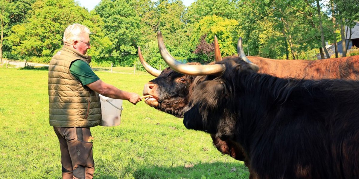Kein Gedanke daran, dass dieser Rundgang einer seiner letzten ist. Kein Gedanke an die bevorstehende Rente, die kommenden Tage und Jahre ohne das Wildgatter, ohne Rothirsche, Falken, Raben, Kaninchen, Waschbären, Wildkatzen, Enten, Ziegen und Kamerunschafe, ohne die riesigen Schottischen Hochlandrinder. Ohne die tausenden Besucher des Wildgatters, von denen ihn viele seit Jahrzehnten kennen, und er sie.