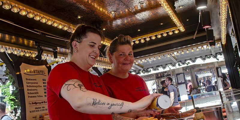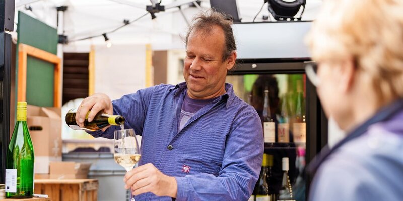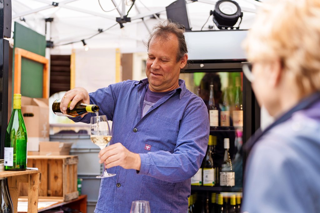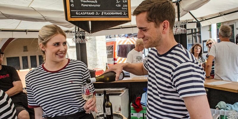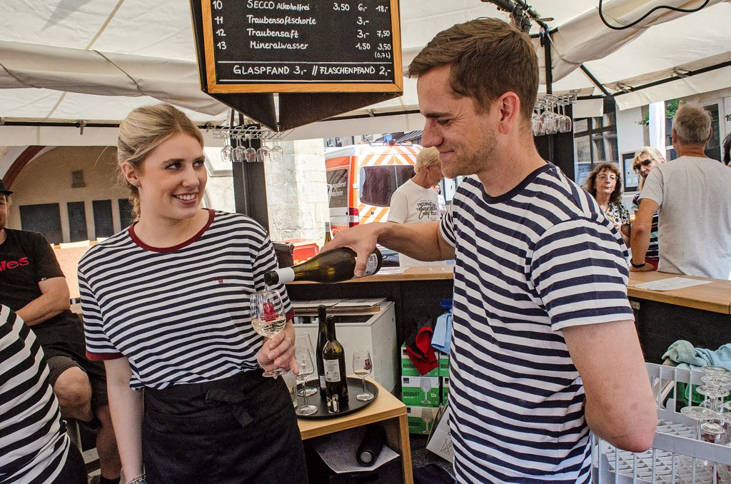 Das Weingut Dr. Balzhäuser gehört quasi schon fest zum Inventar des Weinfests: In diesem Jahr sind die Winzer aus Rheinhessen zum 43. Mal auf dem Marktplatz mit dabei. Und da wird auch von Johannes Balzhäuser natürlich auch stilecht ausgeschenkt – der verwunderte Blick von Antonia Lassalle bringt ihn jedenfalls nicht aus dem Konzept. Foto: Geoffrey May