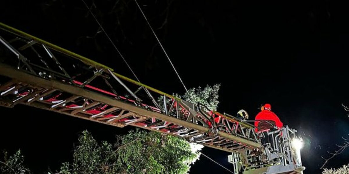 Im Hildesheimer Ortsteil Einum ist gegen 2 Uhr in der Nacht ein Nadelbaum auf eine Freileitung gefallen. Die Feuerwehr sägte den Baum von der Drehleiter aus mit einer Kettensäge ab, wie ein Sprecher am Morgen berichtete.