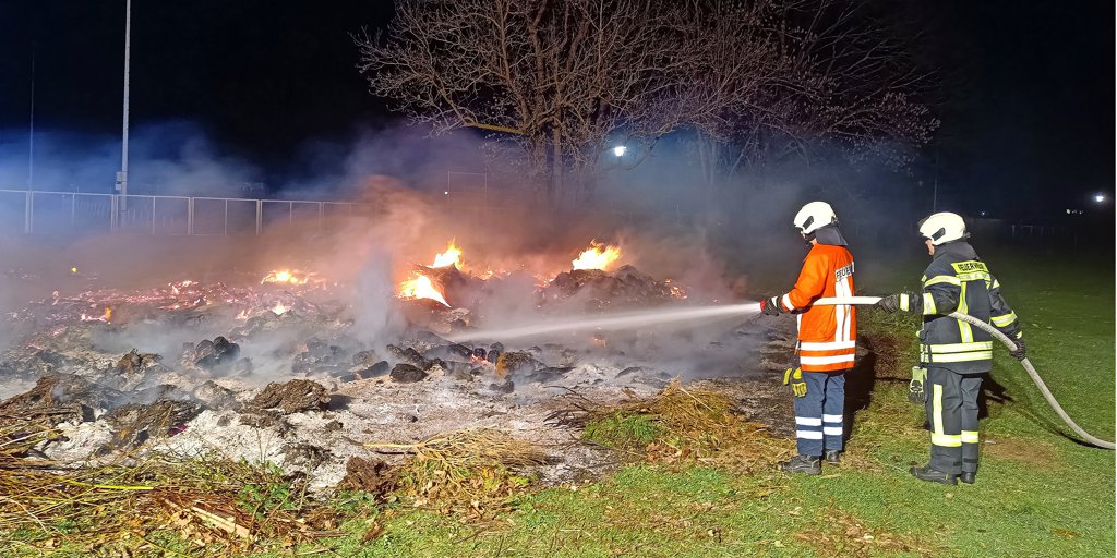 Gronau - Unbekannte haben das Osterfeuer am Freibad in Gronau schon vorzeitig entzündet. Gemeldet wurde das der Polizei am Samstag gegen 2.10 Uhr. Nach bisherigen Erkenntnissen der Ermittler brannte das Feuer jedoch bereits gegen 0.30 Uhr. Die Freiwillige Feuerwehr Gronau, die gegen 2.11 Uhr in die Kuhmasch alarmiert wurde, löschte das Feuer mittels zweier Rohre ab und verhinderte damit eine Ausbreitung, wie Dennis Kleinert, Pressesprecher Gemeindefeuerwehr Leinebergland, berichtet. 16 Mitglieder der Feuerwehr waren im Einsatz, auch zwei Streifenwagen der Polizei waren vor Ort.