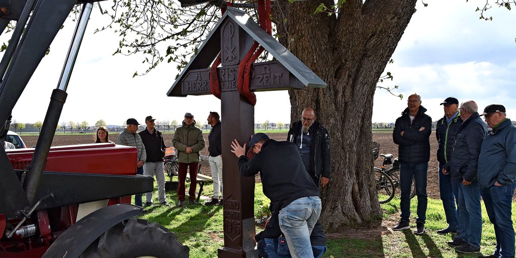 Unbekannte haben das Feldkreuz zwischen Borsum und Harsum vor vier Jahren herausgerissen und zerbrochen – jetzt steht es wieder