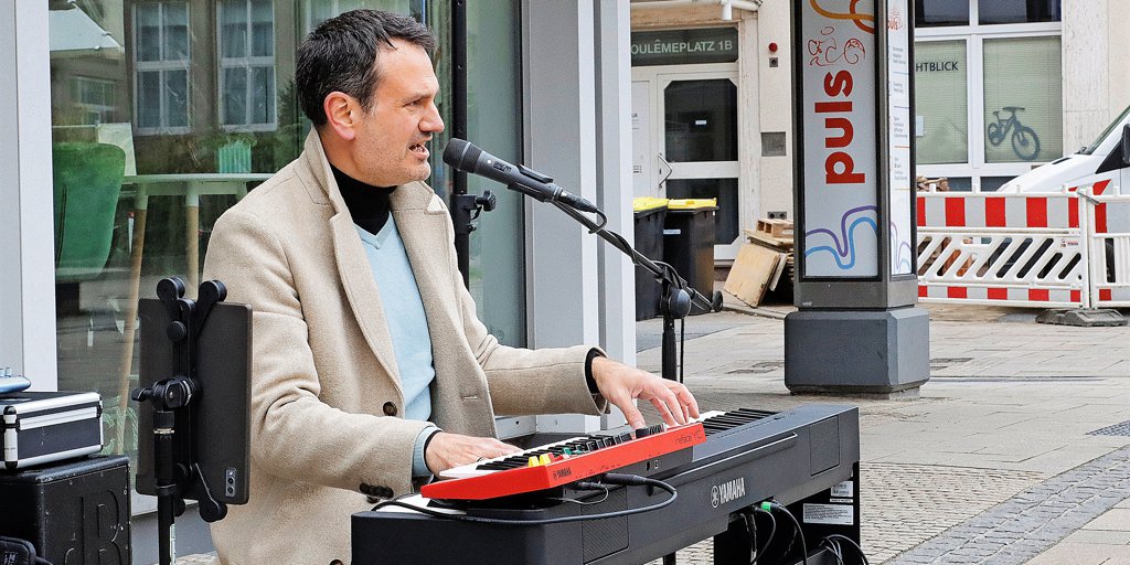 Nimm Platz, das klingt nach willkommen sein und es sich gemütlich machen. Was das angeht, kann das Orga-Team in den kommenden Wochen noch eine Schippe drauflegen. Beim Start der Reihe sah das nämlich so aus: Emanuel Jahreis hatte sein E-Piano vor dem Puls aufgebaut, neben sich eine Kiste mit selbst produzierten CDs, hinter sich eine kleine Verstärkeranlage und im Schaufenster ein Videobildschirm, der mit einem Standbild darüber aufklärte, dass es so etwas jetzt jeden Donnerstag gibt.