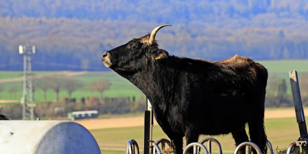 Keil öffnet die Kofferraumklappe und holt ein paar Laibe Brot heraus: „Löckchen, Bienchen, Valentin!“, ruft sie und einige Tiere setzen sich in Bewegung. Nur Günther bleibt noch stehen und checkt die Lage. Tatsächlich seien die Erben des Urs noch recht wild, erklärt Volm. Der Schutzinstinkt sei bei diesen Tieren besonders ausgeprägt. Sie passen sehr gut auf ihren Nachwuchs auf. „Besser als Galloway“, sagt der Landwirt. Die Kühe bildeten einen Kindergarten mit einer Aufpasserin, die die Kälber im Blick behält, während die anderen Muttertiere grasen. „Die würden ihre Kälber nie allein lassen, um zu fressen“, ergänzt Keil. Außerdem sind die Auerochsen sehr wehrhaft. Würde ein Wolf die Herde angreifen – Günther würde ihm die Stirn bieten. „So lange kein Rudel Wölfe hier etabliert ist, haben wir kein Problem“, sagt Volm. Wohl aber, wenn es so wäre, denn mit Weideschutzzäunen ist es so eine Sache im Naturschutzgebiet.