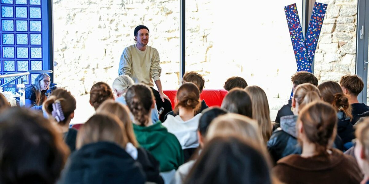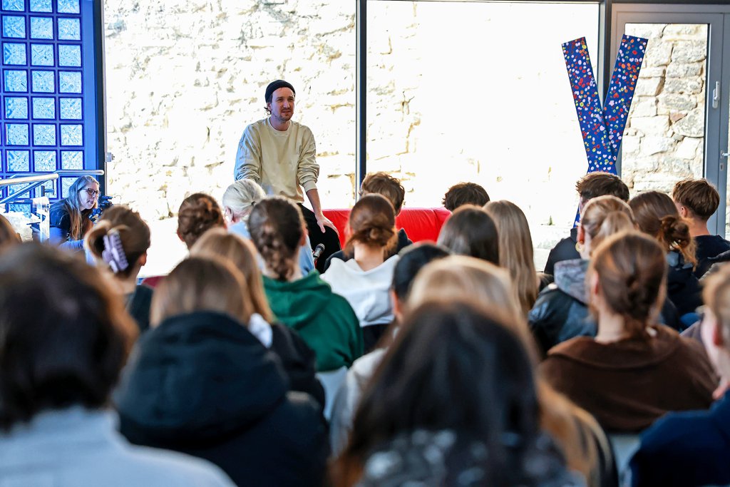 Sein Wissen gab er während eines Theater-Workshops nun auch an die aktuellen Schülerinnen und Schüler des Gymnasiums weiter. Die Jugendlichen durften ihn außerdem mit Fragen zu seinem Privat- und Berufsleben löchern. Dabei holte er weit aus. Später wussten die Jugendlichen nicht nur über sein miserables Mathe-Abi und Unfälle am Filmset Bescheid, sondern auch über Drohnenflüge und Elefanten.