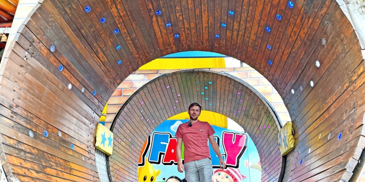 Wieder auf dem Boden angekommen, gibt’s von mir nicht nur einen Daumen hoch für den Aviator, sondern auch einen gespannten Blick um die Ecke. Denn dort wartet eine weitere neue Attraktion auf mich, auf die ich mich besonders gefreut habe: das Fun House. Von diesem bunten, leuchtenden Gebilde lacht mich unter anderem Super Mario an – mir als Nintendo-Fan geht dabei natürlich das Herz auf. Als ich meinen Blick davon endlich abwenden kann, sehe ich, dass sich jede Menge dreht und bewegt, wackeln tut’s auch. Das wird ein Spaß! Mein Vorteil, weil am Nachmittag noch wenig los ist: Ich kann so oft vor und zurück gehen, wie ich möchte. Besonders beim Teil namens „Wash Express“ mache ich davon auch mehrfach Gebrauch (was genau das ist, verrate ich allerdings an dieser Stelle allerdings noch nicht – ein bisschen Spannung muss ja schließlich noch bleiben).