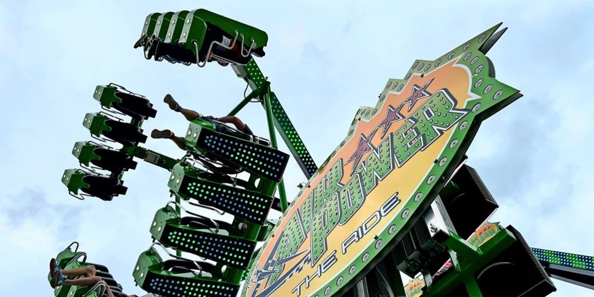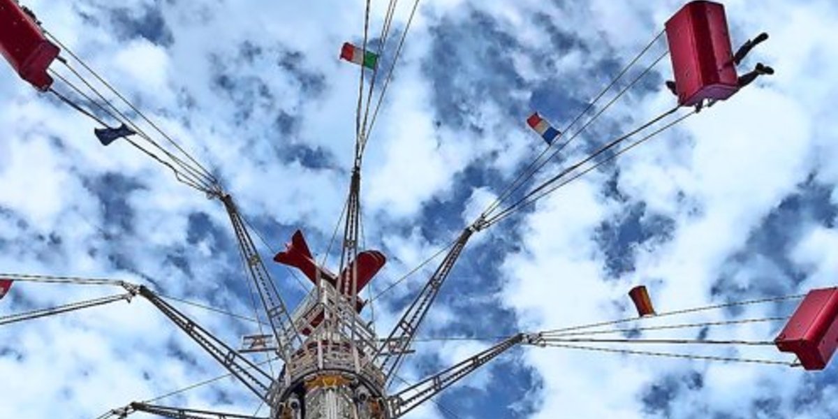 Dabei bemerke ich, dass über der Sitzbank vor mir eine Deutschlandfahne an den Ketten weht. Und ich sitze unter der Frankreich-Flagge. Auswirkungen auf die EM hat das nicht. Hoffe ich zumindest. Etwas unentspannter werde ich, als ich während meiner Runden ein weiteres neues Fahrgeschäft unten auf dem Volksfestplatz erblicke: den Airpower. Doch über den will ich erstmal gar nicht weiter nachdenken und mir mein wohliges Gefühl nicht nehmen lassen. Rund drei bis vier Minuten dauert die Fahrt im Aviator, bis zu 20 Personen können einsteigen. Kinder ab 6 Jahren und 1,10 Metern Körpergröße dürfen mitfahren, wer jünger ist als acht, muss von seinen Eltern begleitet werden. Ein Ticket kostet vier Euro, drei Tickets gibt es für zehn Euro.