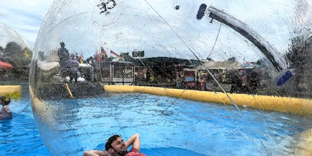 Denn zum Ende meiner Schützenfest-Tour habe ich mir etwas aufgehoben, was ich immer schon mal machen wollte: Übers Wasser laufen. Gut, ich gebe zu, ich bin in einem mit Luft gefüllten Riesenball, aber wer will schon päpstlicher sein als der Papst? Also: Schuhe aus, dann wartet aber schon die erste Herausforderung. Denn obwohl man die Attraktion ausdrücklich auch als Erwachsener nutzen darf, ist der Schlitz, durch den man in den Ball kommt, eher für Kinder ausgelegt. Mit ein bisschen Geschick habe ich es schließlich geschafft, dann darf ich über eine kleine Holzrampe ins Wasser rutschen – und lande mit meinem Po erst einmal für einen kurzen Moment auf dem Boden des riesigen Planschbeckens. Doch das ist nur eine Momentaufnahme, dann treibe ich auf dem Wasser. Von der Idee, darauf zu laufen, muss ich mich allerdings schnell verabschieden. „Krabbeln“, ruft mir Betreiber Joel Spindler zu – und ich sehe schnell ein, dass das ein sehr sinnvoller Tipp ist.