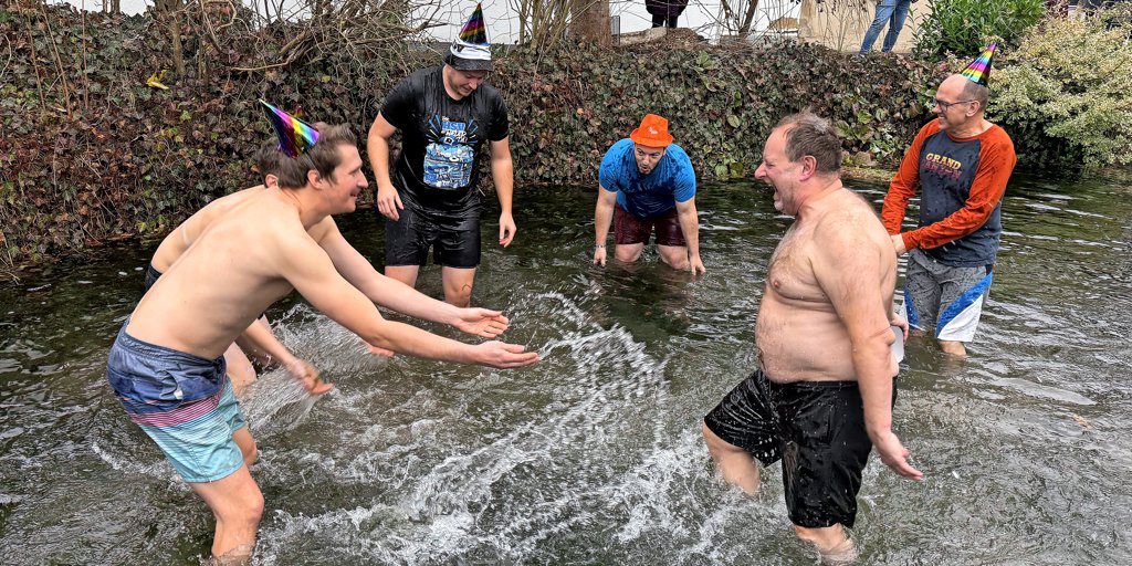 Planschen im 9 Grad kalten Wasser: Sechs Mutige trauen sich in den Langenholzer Gottesbrunnen – und haben jede Menge Spaß