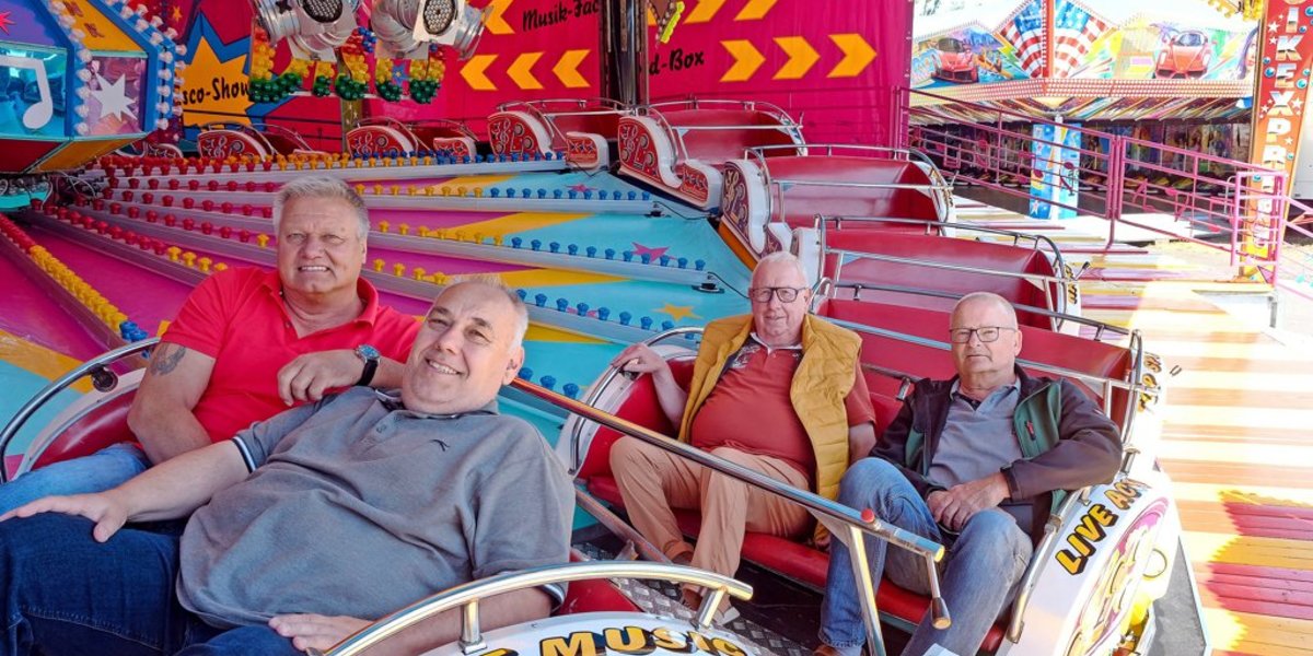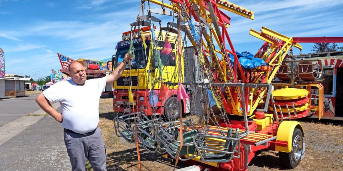 Und damit auch mit John Wiegand und seinem Kiddy Fly. Kettenkarussell war gestern. Jetzt geht es rund und ab in die Höhe. Zwei Meter, das ist für Kleine schon ziemlich hoch. Wer lieber Papa oder Mama neben sich sitzen hat, kann das, neben kleinen gibt es auch immer breitere Sitze für Erwachsene, sagt Wiegand, der in der sechsten Generation auf Volksfesten unterwegs ist. Und sein neunjähriger Sohn sagt auch schon, dass „Kirmes sein Leben ist“, lacht Wiegand. Nach zwei Jahren Abstinenz von Fahrgeschäften fehle kleinen Kindern schon diese körperliche Erfahrung, fügt er hinzu. Gut also, wieder damit anzufangen: „Wir sind jedenfalls froh, dass es wieder losgeht.“