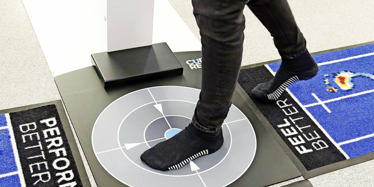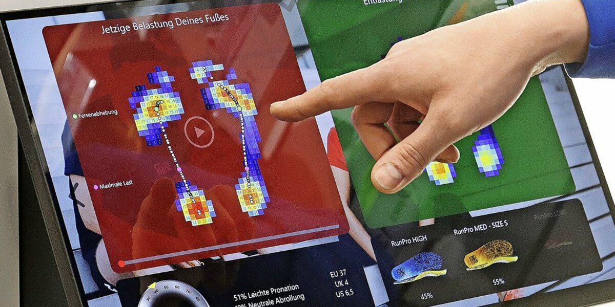 „Fangen wir mit dem wichtigsten an“, sagt Wolpers und bittet Laura zur Laufanalyse in die Schuhabteilung. Die „Kundin“ soll über eine kleine Laufbahn gehen und zwischendurch zweimal abstoppen. Auf einem Monitor erscheinen ihre Füße mit farbigen Punkten und Flächen. „An den roten Stellen ist die Belastung am größten“, erklärt Wolpers. Man müsse bedenken, dass die Schuhe beim Joggen das dreifache Körpergewicht abfedern müssen.“ Heißt: Eine gute Dämpfung ist sehr wichtig.