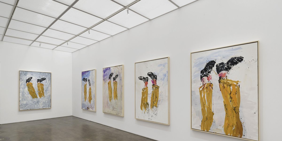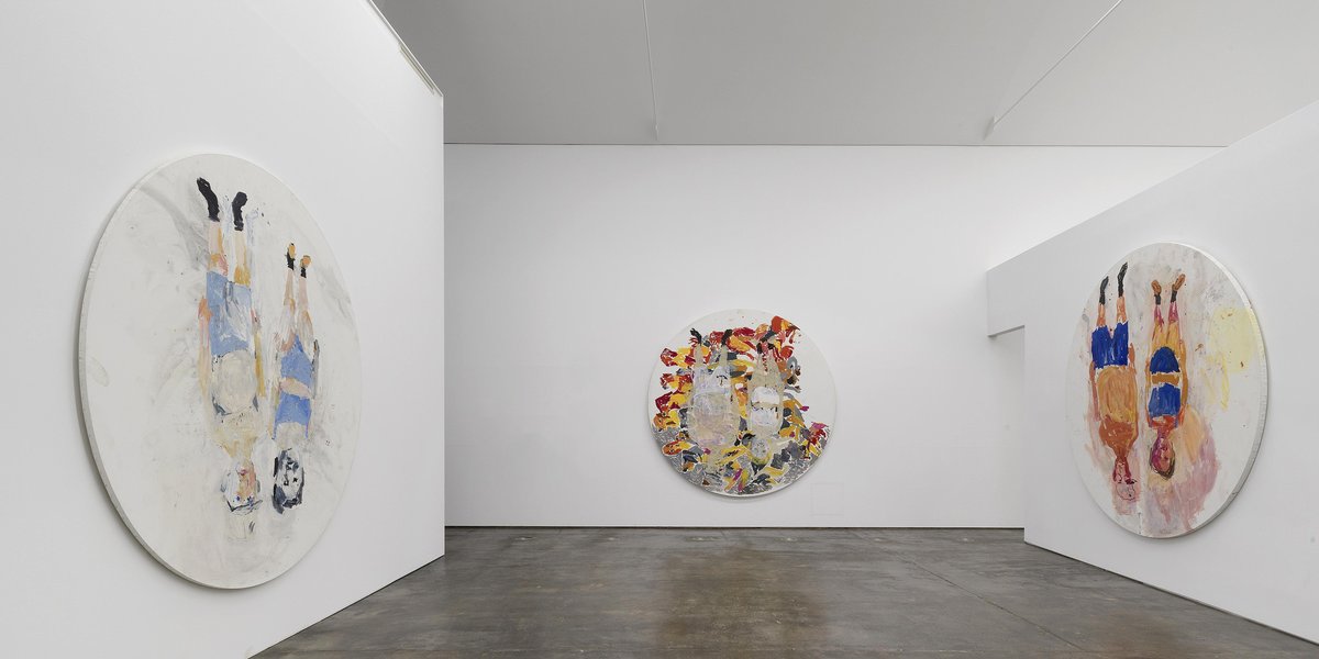 Besonders macht die Ausstellung auch, dass viele Bilder in einen Kontext gestellt werden. Teilweise sind Zyklen zu sehen aus Werken, die ähnliche Motive zeigen. Beispielsweise Baselitz und seine Frau Elke. Sie scheinen, für den Künstler typisch, kopfüber in den sechs kreisrunden Gemälden zu schweben. Die großformatigen Doppelporträts basieren auf einem Foto, das den Künstler und seine Frau in Unterwäsche zeigt.