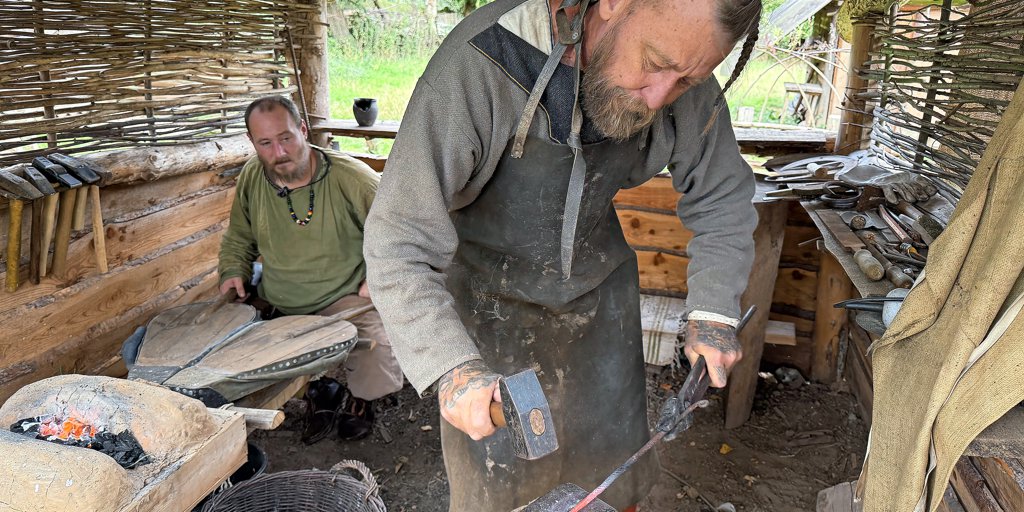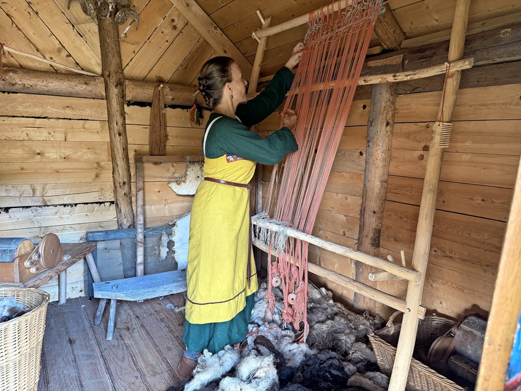 Denn zum dörflichen Leben der Wikinger gehört „nicht jeden Tag Krieg und Klopperei“, macht Berwyn klar. „Wir versuchen hier, ein authentisches Bild einer Wikingersiedlung von vor 1000 Jahren darzustellen“, erklärt Aud. In Fjallidhal liegt der Fokus auf dem friedlichen Zusammenleben und dem Handwerk. Im Dorf gibt es eine Schmiede, eine Wollstube, eine große Feuerstelle und einen Lehmofen. Möbel, Küchenutensilien, Kleidung und Dekorationen stellen die Dorfbewohner selbst her – und das möglichst so, wie es die Wikinger vor 1000 Jahren getan haben. „Wir benutzen, wenn es geht, keine modernen Werkzeuge“, sagt Berwyn.