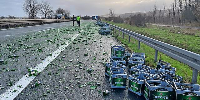 Zahlreiche Bierkisten und zerbrochene Flaschen auf der Fahrbahn: A 39 bei Holle war bis zum Nachmittag gesperrt