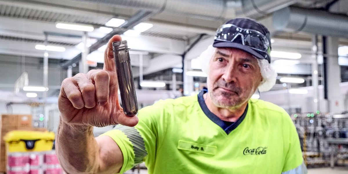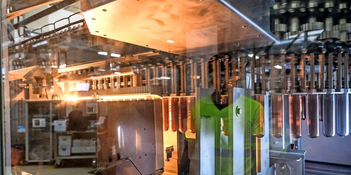 Der Betriebsleiter steht nun neben der Anlage, in der aus kleinen, knapp 20 Gramm leichten und rund zehn Zentimeter hohen Rohlingen, die aussehen wie Reagenzgläser mit Gewinde an der Öffnung, PET-Einwegflaschen geblasen werden. In rasender Geschwindigkeit werden die durchlaufenden, zum Großteil aus recyceltem Material hergestellten Rohlinge erwärmt, ehe sie in Formen geblasen und zu 1,5-Liter-Flaschen werden. Etiketten draufgeklebt, mit Folie zu Viererpacks gebündelt, fertig. Auch an dieser Anlage gab es Einsparpotenzial. Wie warm müssen die Rohlinge sein, und wie hoch muss der Druck fürs Blasen der Flaschen tatsächlich sein? Die Hildesheimer haben fortlaufend überlegt, berechnet und ausprobiert, um beide Parameter Temperatur und Druck in ein Verhältnis zu bringen, das gewohnte Qualität garantiert und zugleich Energie spart. Seit 2020 läuft die Einweganlage mit deutlich niedrigerem Druck. Energieeinsparungen pro Jahr laut Coca-Cola: 350.000 Kilowattstunden.