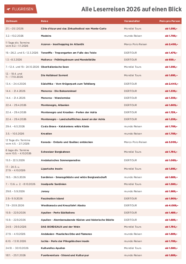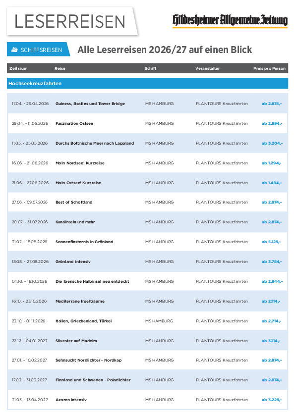 Leserreisen Hildesheimer Allgemeine Zeitung in Kooperation mit Pülm Reisen GmbH